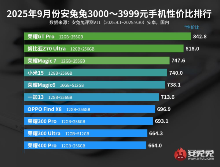这款手机是今年4月份上市的,原本发布初期起售价为3699元,国补后为3199元,本身就有极高的性价比,上市之后连续多个月荣获了3000~4000价位的性价比冠军这里特别需要说明一下。一般情况下,几乎每个月安兔兔都会更新上一个月的手机性价比排行,而来到10月份之后,安兔兔又公布了9月份的性价比排行,目前榜单显示,荣耀GT Pro再一次拿到了3000~3999元手机性价比冠军的宝座。